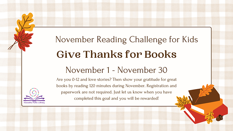 This month, kids 0-12 are encouraged to show their gratitude for stories, imagination, and learning. Read for just 120 minutes and you’ll earn a reward!
