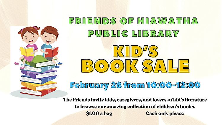 The Friends of Hiawatha Public Library are hosting a special sale with great kids’ books. Fill a bag we will provide for just $1—cash only please!