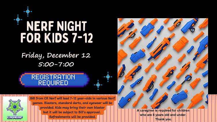Join Bill from CR Nerf for action-packed Nerf games designed for kids ages 6–12! All gear—blasters, darts, and protective eyewear—will be provided. Kids are welcome to bring their own blasters, as long as they pass Bill’s safety check.