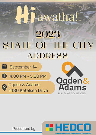 The Hiawatha State of the City Event, brought to you by HEDCO, will be held at Ogden & Adams (1480 Ketelsen Dr.) on Thursday, Sept. 14 from 4-5:30 p.m. As always, the City will highlight many of the past years accomplishments and present all the new and exciting things happening in Hiawatha.