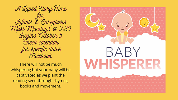 Cuddle up with your baby and join Ms. Alicia for rhymes, songs, and stories that will soothe your wee one. This program meets most Mondays at 9:30 on Facebook. Check our calendar for specific dates.