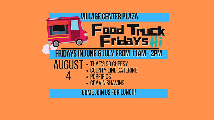 We can't wait to welcome Food Truck Friday's to the Village Center Plaza from 11am - 2pm every Friday during the months of June, July and August! Each week there will be four delicious food trucks on site!