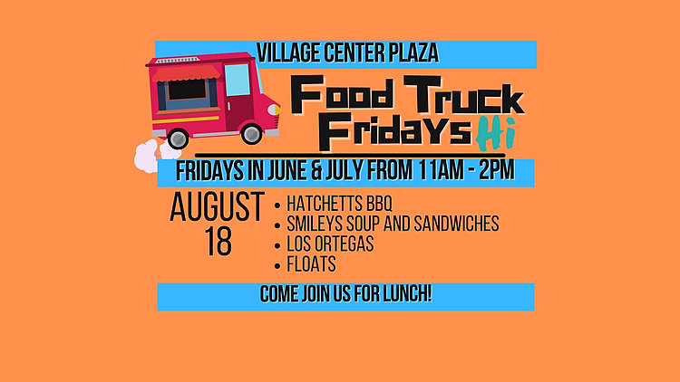 We can't wait to welcome Food Truck Friday's to the Village Center Plaza from 11am - 2pm every Friday during the months of June, July and August! Each week there will be four delicious food trucks on site!