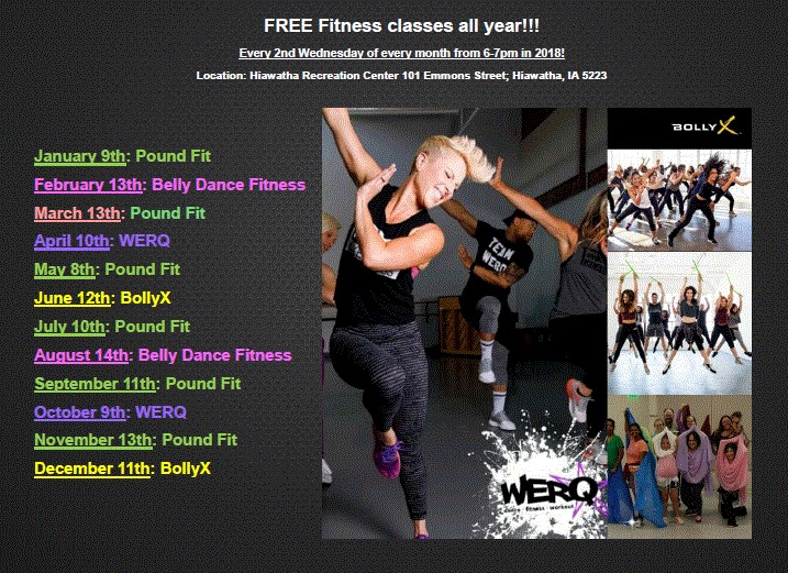 All are welcome to free fitness classes every 2nd Wednesday of every month in 2019! Classes include: POUND Fit, Belly Dance Fitness, WERQ, and BollyX! See below for descriptions and dates!