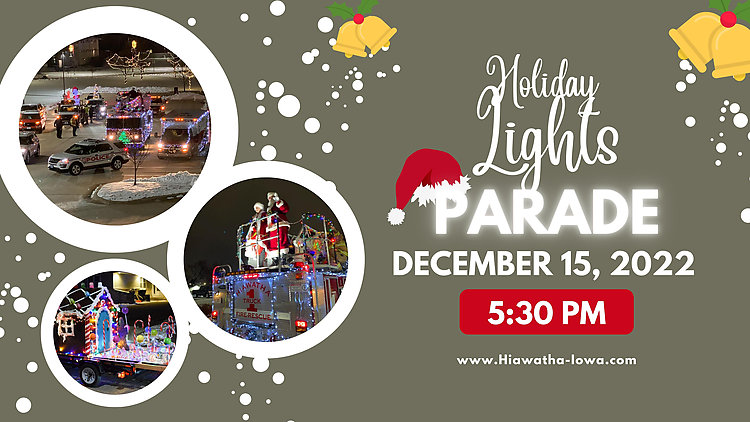 Brew some hot cocoa (don't forget the marshmallows!), bundle up and get ready to witness Hiawatha's 3rd annual Holiday Lights Parade featuring Mr. and Mrs. Claus! If you don't see your house on the map then bunker down in the parking lot of Guthridge Park (10th Avenue side!) to watch the show! And don't forget, Santa's watching! Find the map at https://www.hiawatha-iowa.com/news/holiday-lights-parade/