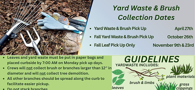 Our first yard waste and brush collection day is Monday, April 27th. Please have all branches and yard waste bags placed curbside by 7:00 AM Monday morning.