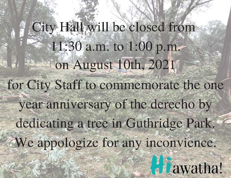Previous Image Next Image City Hall will be closed from 1130am to 100pm on August 10th 2020 for City Staff to commemorate the one year anniversary of the derecho by dedicating a tree in Guthri