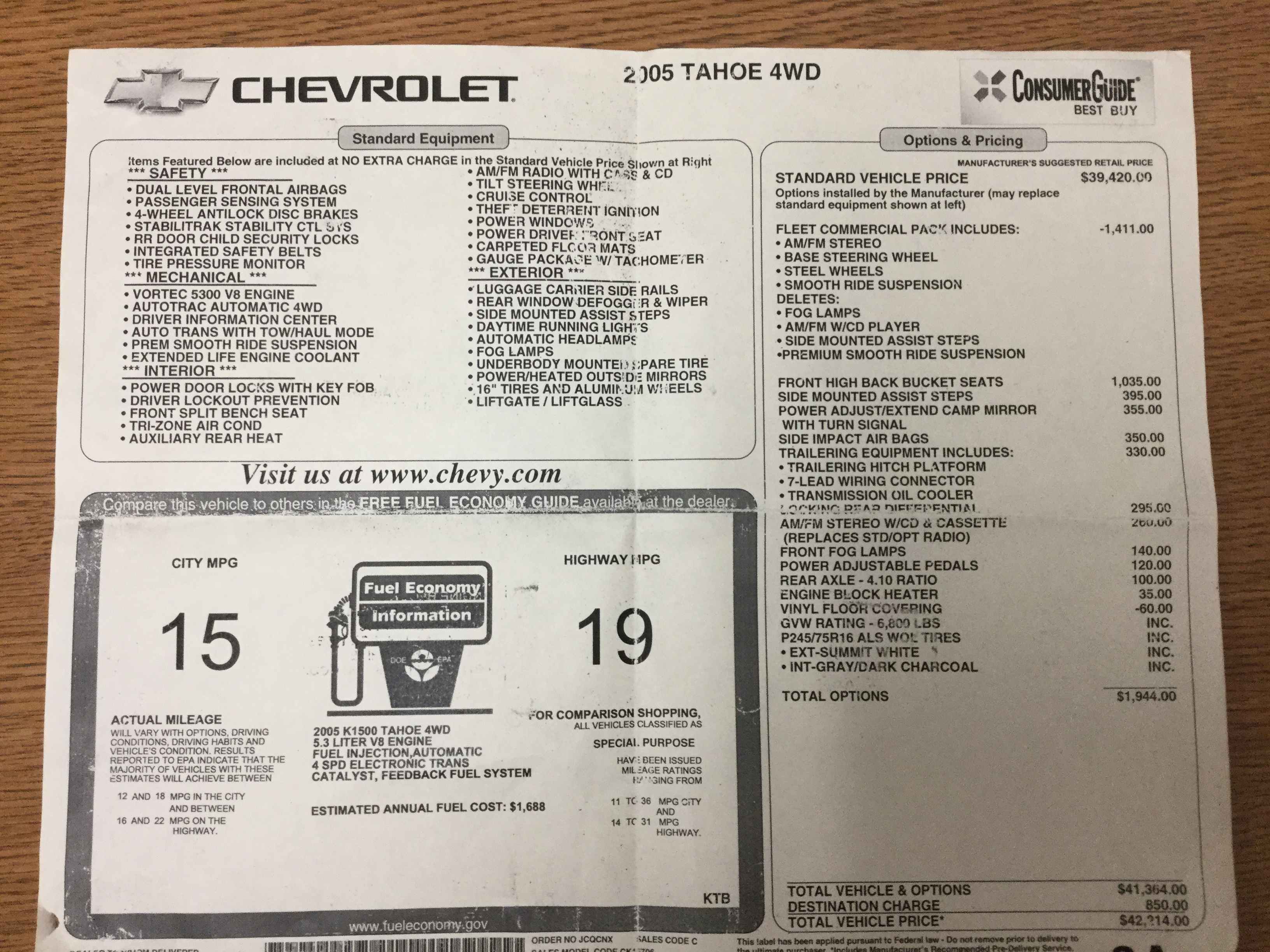 Previous Image Next Image 2005 Chevy Tahoe For Sale 4WD, 5.3L V8, 68,500 miles, good tires, many extras. $9,500 OBO Can be viewed at 1410 Robins Road, Hiawatha, IA. Hours are 7:00 AM to 3:30 PM. Call 319-393-6601 for an appointment.